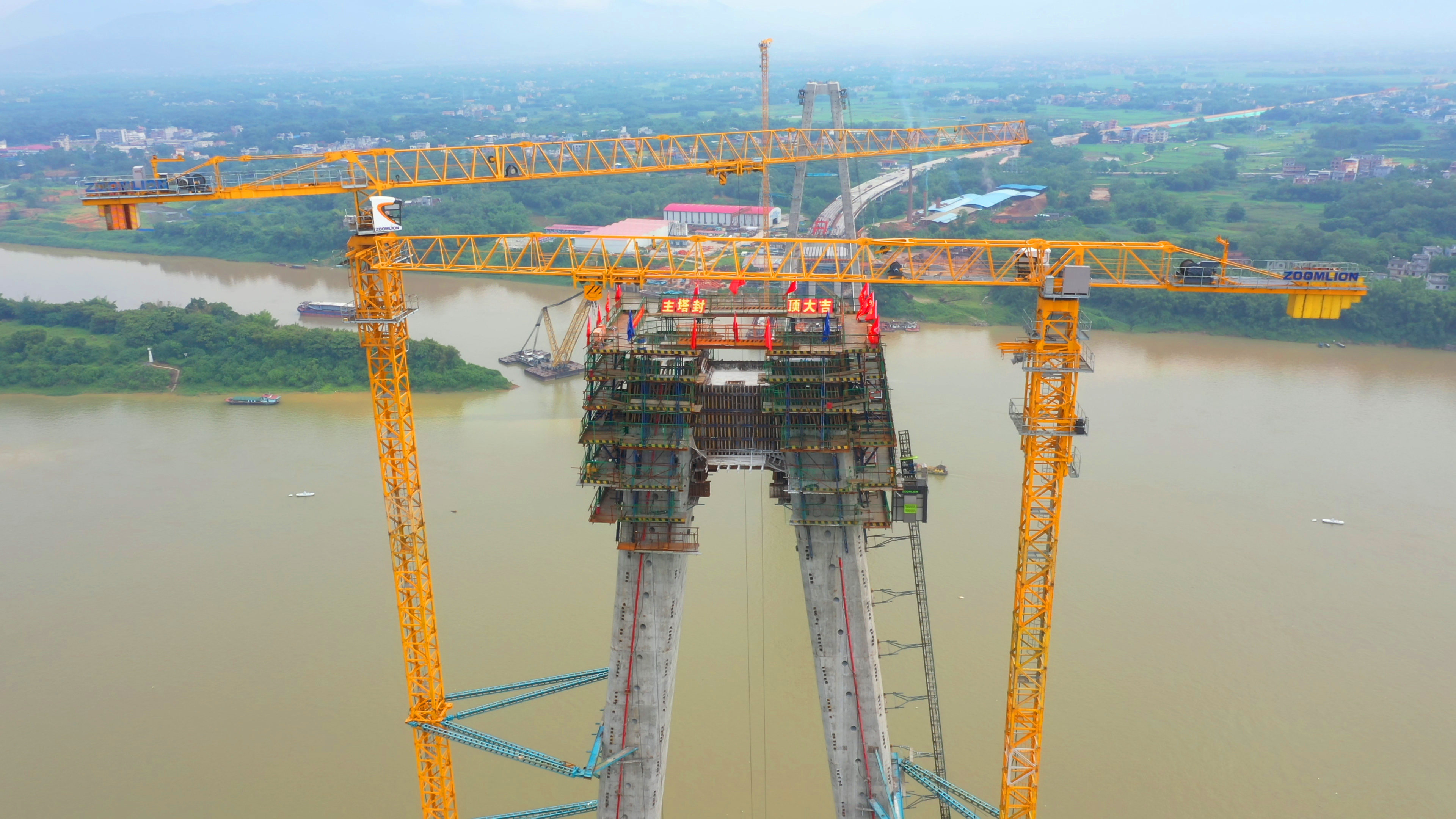 廣西最大跨徑斜拉橋—荔玉高速平南相思洲特大橋主塔順利封頂
